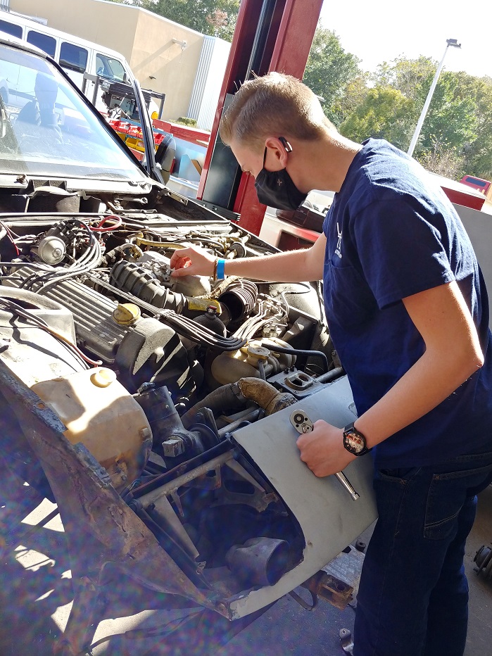The high school dual enrollment students who started in January are becoming very familiar with all the tools available to perform an engine removal. The student pictured is already self-reliant as he prepares the engine for removal.