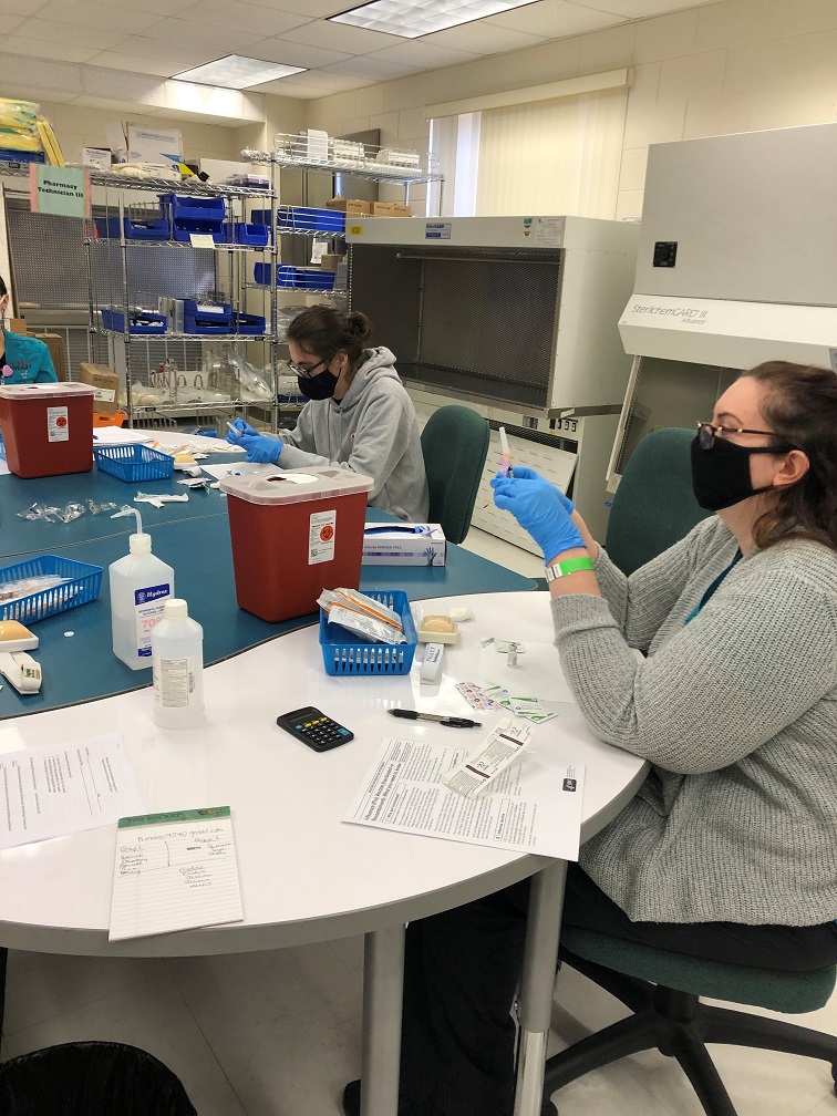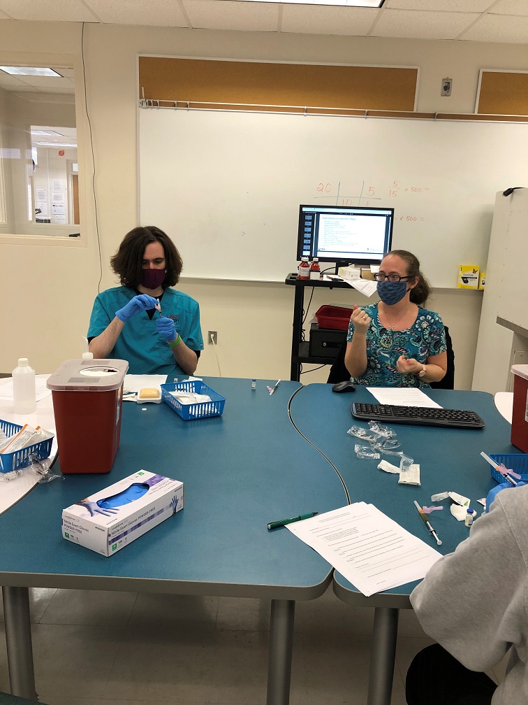 The Pharmacy Tech II students were able to complete their vaccine administration skills training. Students are required to complete a 20 hour training in vaccine administration, including injection technique, storage and handling, and responding to adverse events. Students had to successfully complete a hands on skills assessment to ensure they can use proper procedures to administer both subcutaneous and intramuscular vaccine injections.