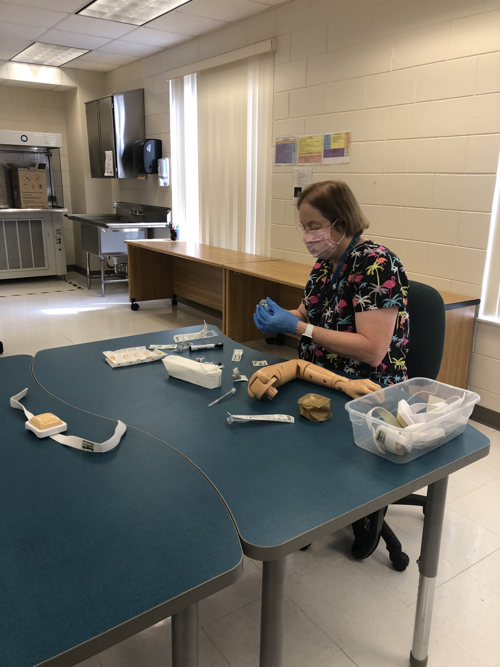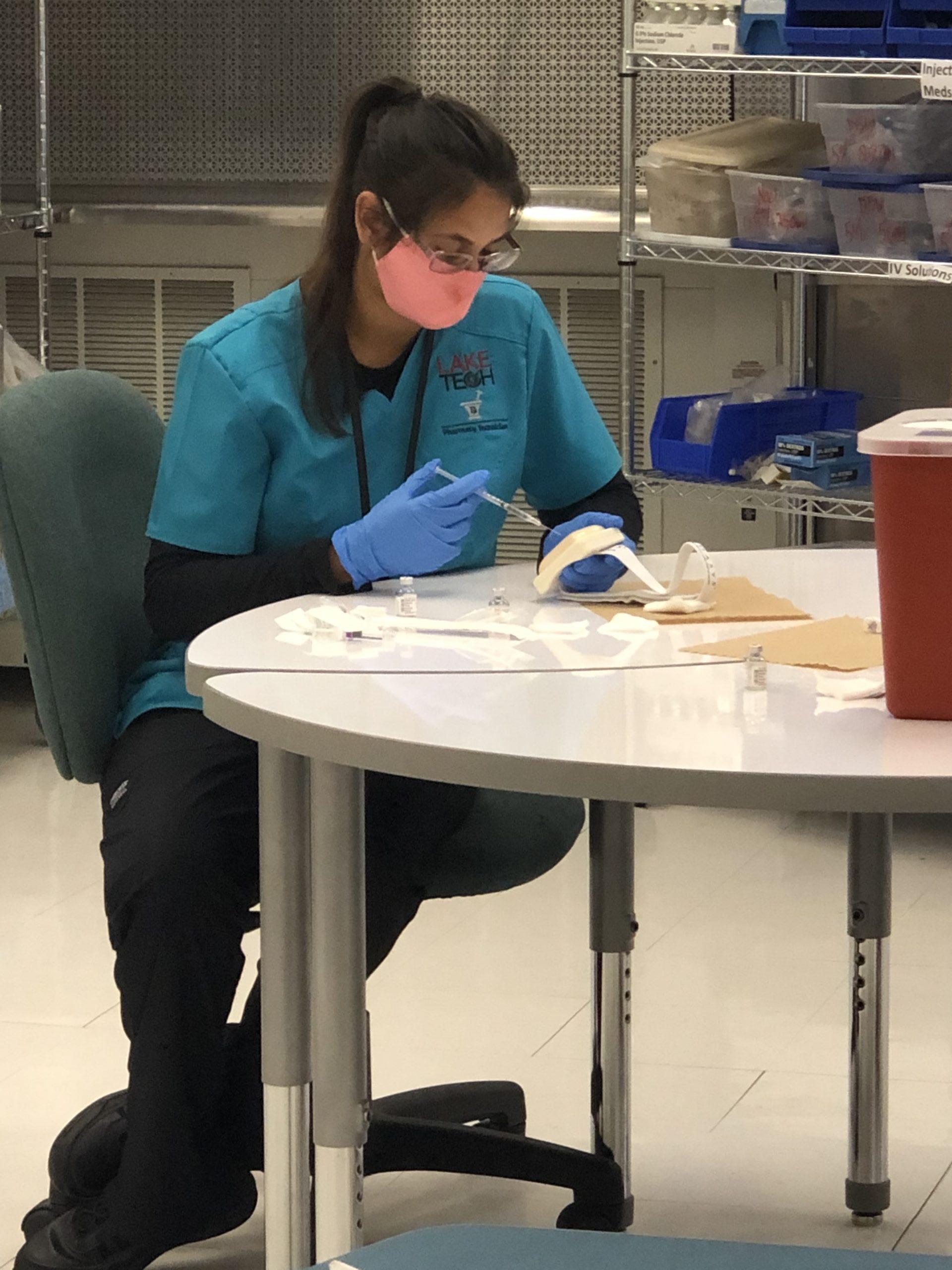 This week, we had Mrs. Willey from the Nursing Department assist in overseeing our vaccine administration lab. Although in Florida, only licensed pharmacists administer vaccinations to patients, some states are transitioning to pharmacy technician administered vaccinations under the direction of a licensed pharmacist. We want to make sure our students are prepared in not only the data entry, forms collection, and third party billing of vaccinations, but also understand the process and procedure of the administration process as their roles may transition in the future.