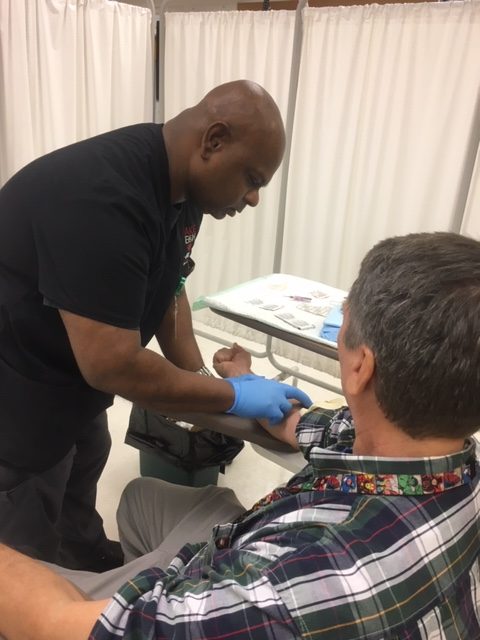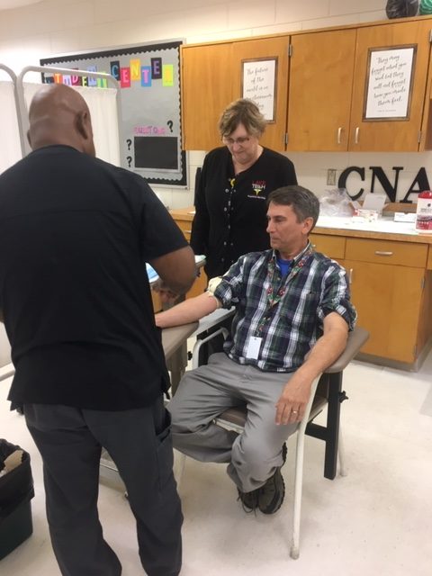 The students in Ms. Hampton’s Patient Care Technician program practiced their phlebotomy skills by setting up a lab and inviting students, faculty, and staff to have their blood drawn. Not only did the students practice their technical skills, but they practiced meeting and greeting the “patients” and providing the good customer skills needed for this type of position.