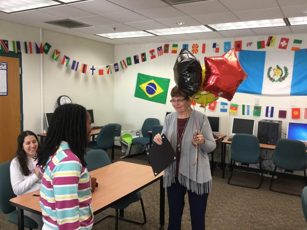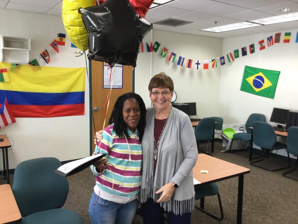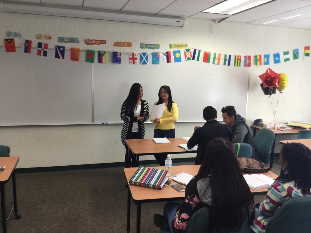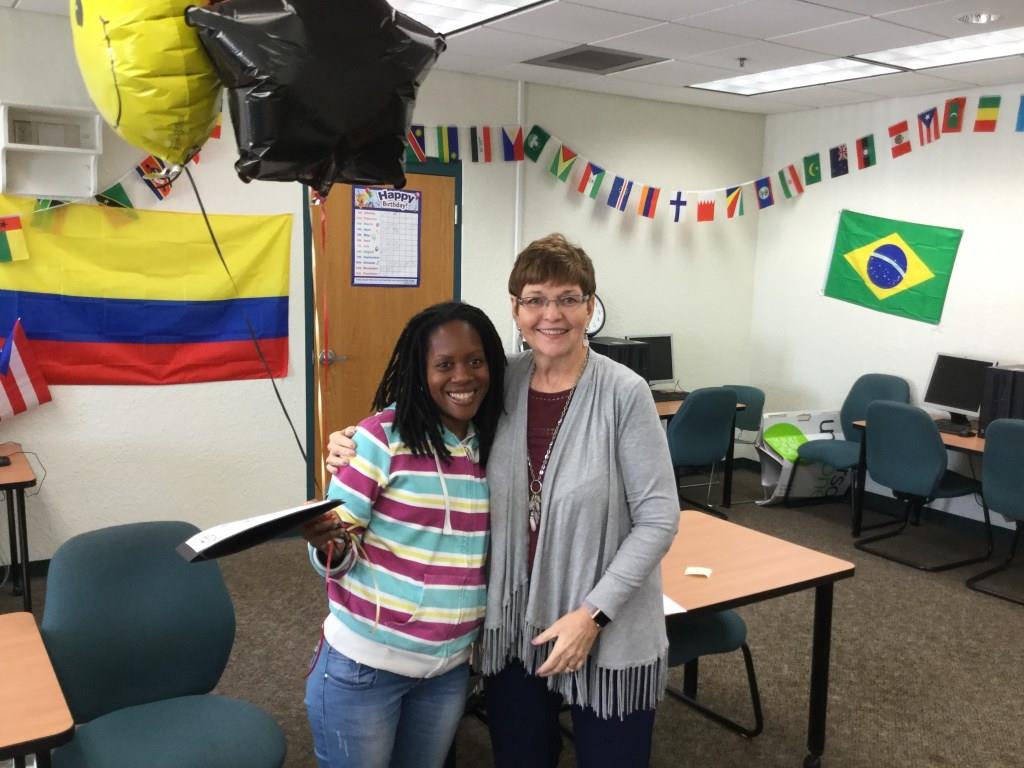 ESOL – Clermont Campus – We had a wonderful time with Dr. Culpepper! She came all the way down to the Clermont campus to present the Student of the Month award to Laurence Jacques. What a wonderful surprise!! The students were practicing their role plays for ordering at a restaurant. We practice every day! We have 25 people in the class and the food that they bring on a regular basis is absolutely fantastic! Please come and visit and share an “arepa” with us!!