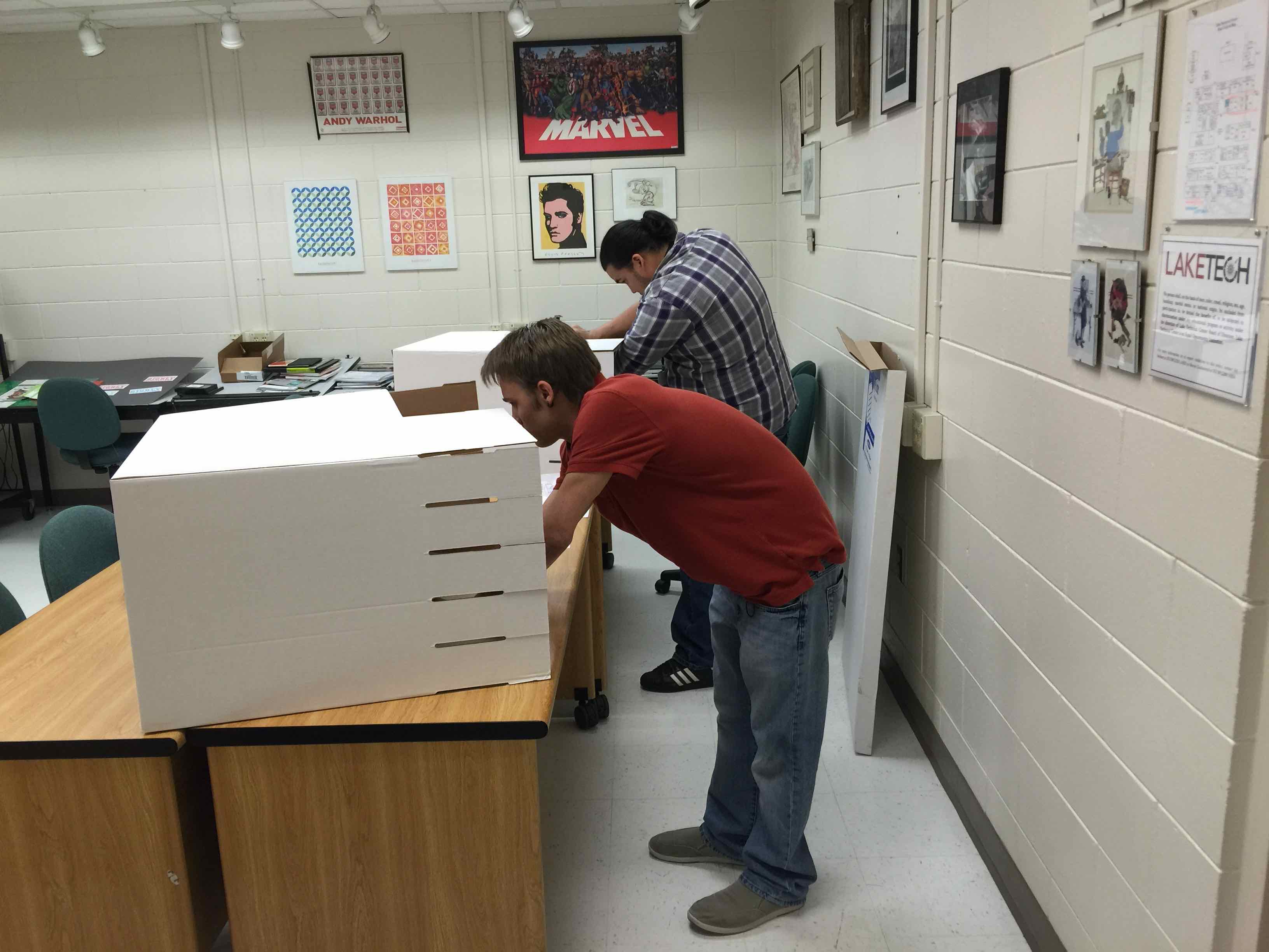 Digital Design – Students in the Digital Design program were working on a variety of projects this week. Some of the designers were following detailed directions to construct corrugated shelves.