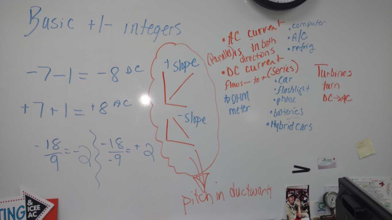 On the integration wagon, P3’s and classmates helped link the basics of learning positive and negative numbers to the standards of HVAC.  Students brainstormed and relayed information to Mrs. Avelli on how positive and negatives are used in: AC and DC current (and what that means) and what objects in the lab used each form, slope (which in HVAC is pitch) and how this is used in duct-work, voltage (increases and drops) using meters, and sine wavelength (just when you thought Trigonometry had gone away). It was a plethora of ideas, correlations, ah-ha moments and fun!