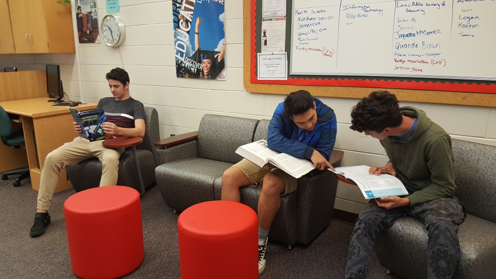 GED – Adult Ed students came together as a whole class to work on a “career/math challenge.” In groups, students had to seek out various geometric shapes and measure dimensions within the nooks and crannies of the Adult Ed Lab. Next, the rest of class had to solve perimeter, area, and circumference of the other groups’ figures. Lots of team building was happening! Then, each group took a turn in the career corner and chose career fields of their interest and picked a reading or math question for the rest of the class to answer.  The career books included detailed information on the trade as well as subject based materials and real-world connections. The focus here was on building communication, college and career linked standards and critical thinking skills.