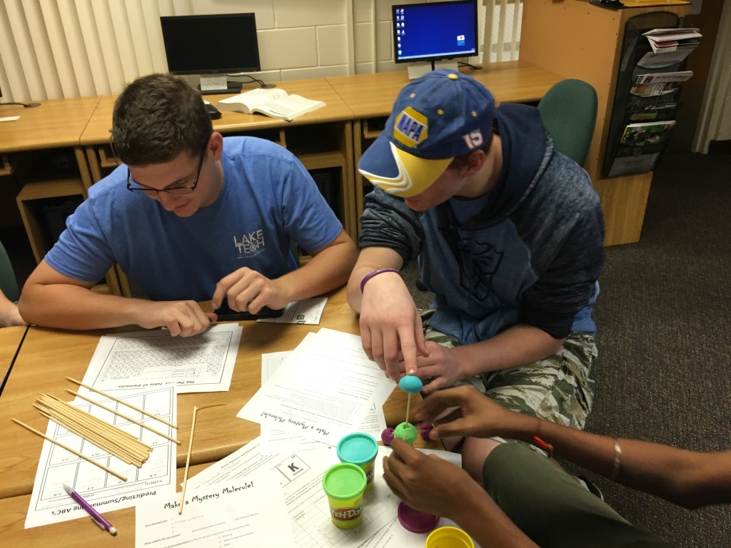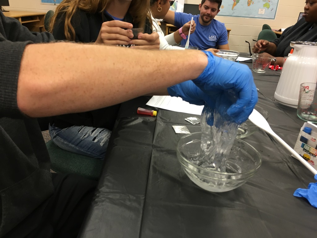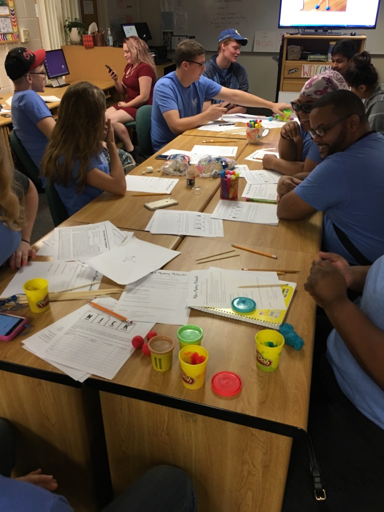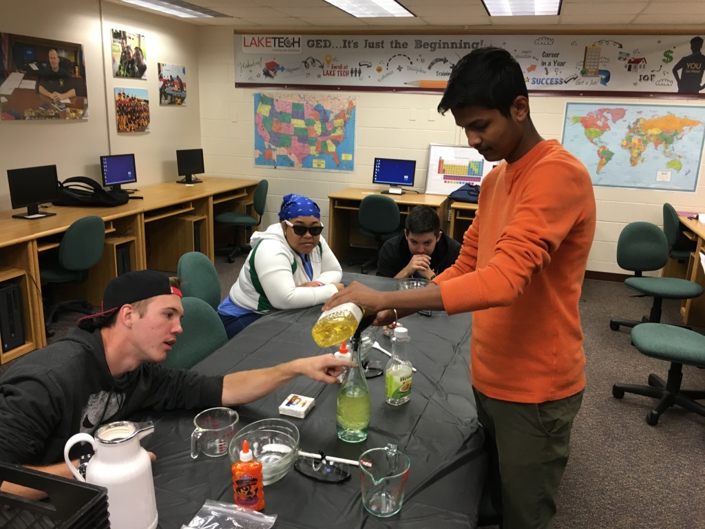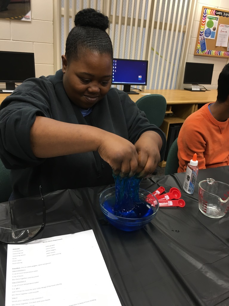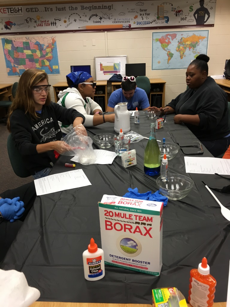 The GED class learned more about atoms, elements, and molecules, by using graphic organizers, brainstorming, working together in teams, and modeling.  They used the periodic table of elements and the 4D elements app to learn about elements, atomic numbers, chemical equations, and what happens when two elements join together to form a molecule and/or compound.  At the end of the lesson, they were able to build their own model of a molecules. The next week, they continued the chemistry compound science lesson this week.  They observed an experiment and then got to participate in one of their own.  The class made a chemical compound – slime!  Quite appropriate for Halloween.  We then set up a science experiment table at the Fall Festival and gave away the directions so students and families could make their own.  Another of our GED students passed her final test and is now a proud high school graduate.  Congratulations Kori!
