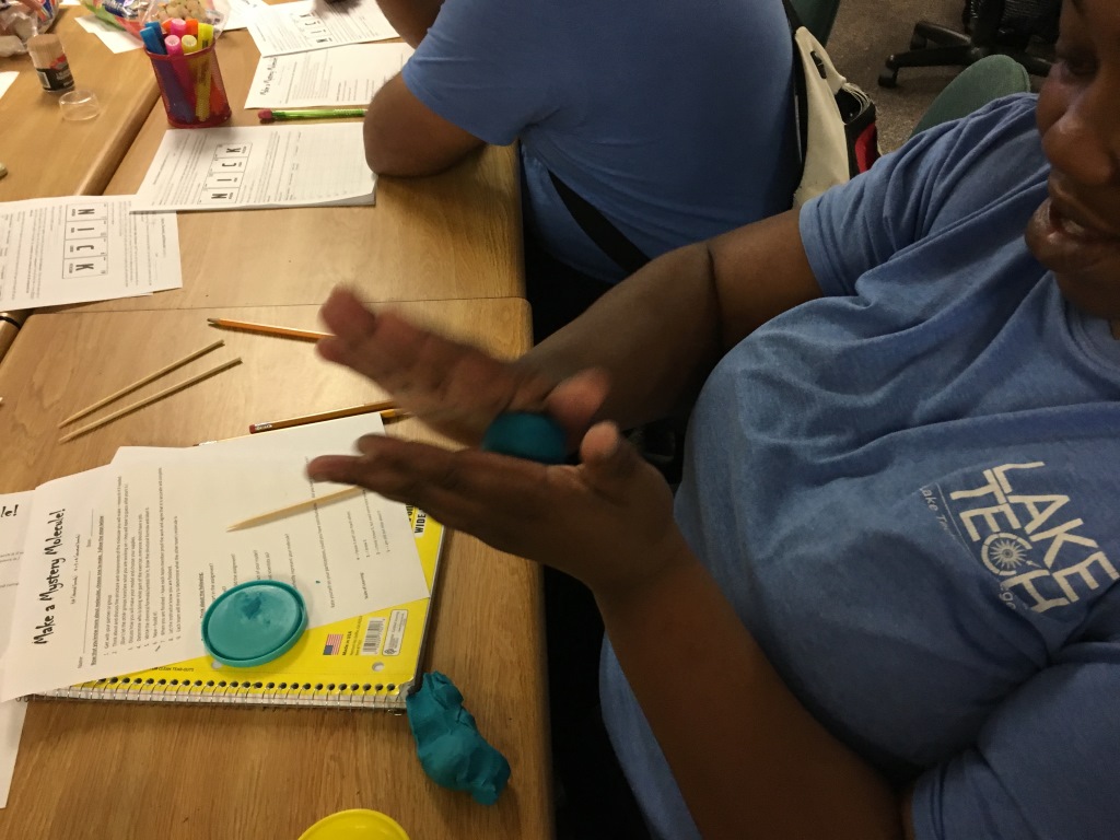 The GED class learned more about atoms, elements, and molecules, by using graphic organizers, brainstorming, working together in teams, and modeling. They used the periodic table of elements and the 4D elements app to learn about elements, atomic numbers, chemical equations, and what happens when two elements join together to form a molecule and/or compound. At the end of the lesson, they were able to build their own model of a molecules. The next week, they continued the chemistry compound science lesson this week. They observed an experiment and then got to participate in one of their own. The class made a chemical compound – slime! Quite appropriate for Halloween. We then set up a science experiment table at the Fall Festival and gave away the directions so students and families could make their own. Another of our GED students passed her final test and is now a proud high school graduate. Congratulations Kori!