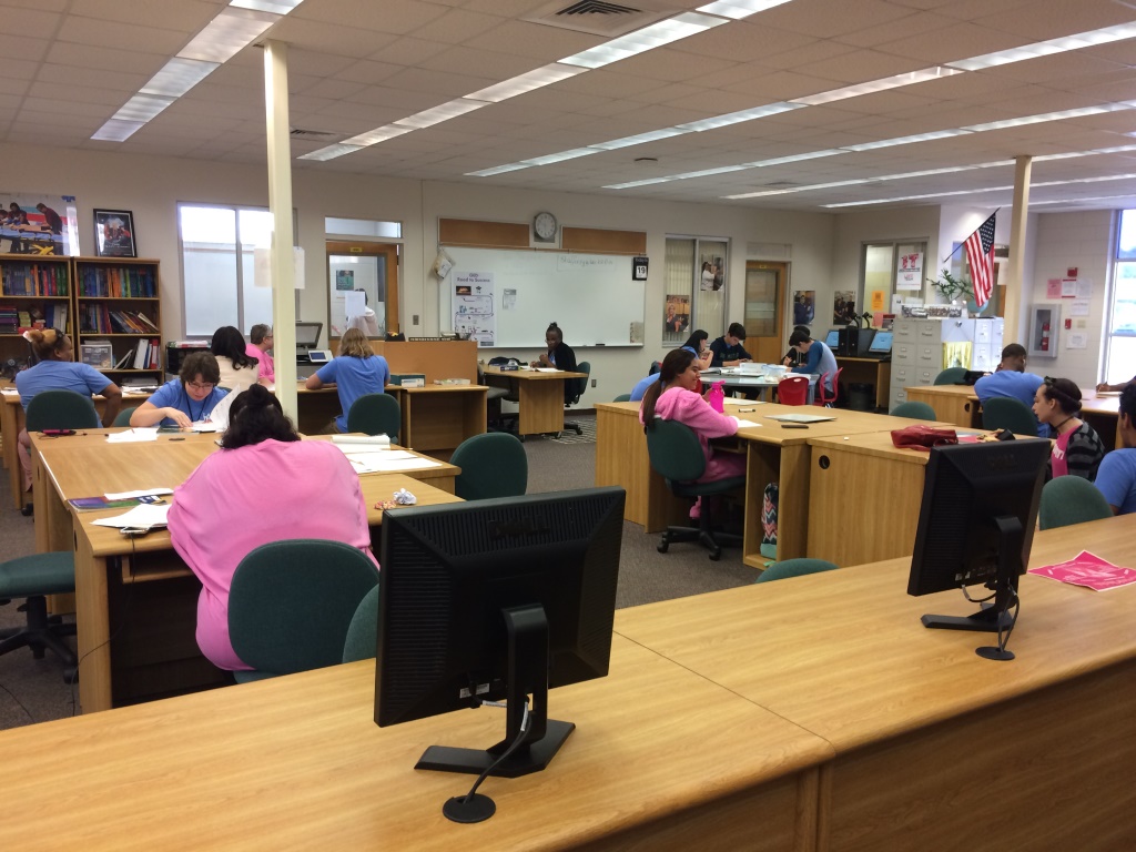 GED – Adult Ed students came together as a whole class to work on a “career/math challenge.” In groups, students had to seek out various geometric shapes and measure dimensions within the nooks and crannies of the Adult Ed Lab. Next, the rest of class had to solve perimeter, area, and circumference of the other groups’ figures. Lots of team building was happening! Then, each group took a turn in the career corner and chose career fields of their interest and picked a reading or math question for the rest of the class to answer. The career books included detailed information on the trade as well as subject based materials and real-world connections. The focus here was on building communication, college and career linked standards and critical thinking skills.
