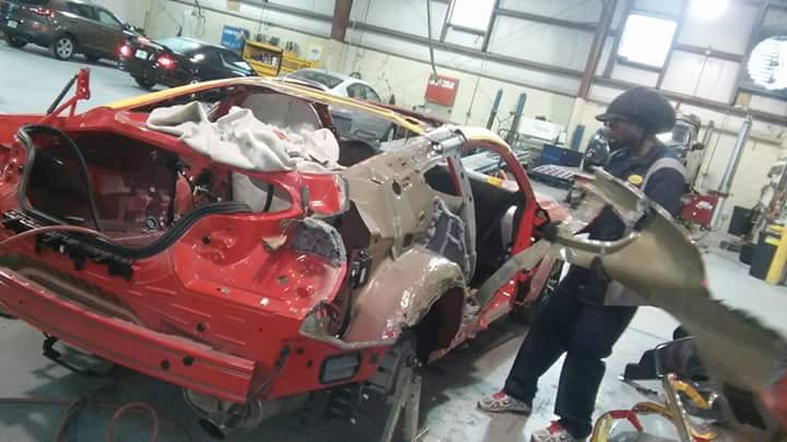 Auto Collision Repair and Refinishing – Student Anthony Peterkin is working at Service King in Orlando as a co-op student. In the picture, he is removing sheet metal from a Mustang that was damaged when it struck a pole.