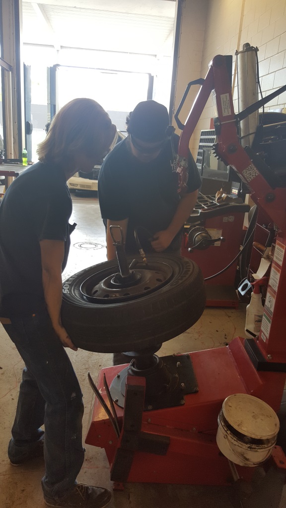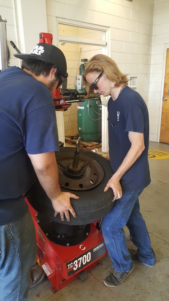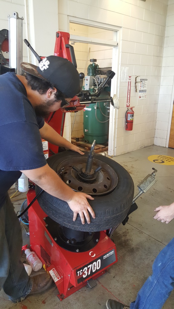 Automotive Service Technology – Students in the pictures are shown dismounting and mounting tires. They’re learning how important it is to safely and correctly operate the equipment as well as the proper way to mount and dismount tires without damaging the tire bead. They’re also practicing to beat the clock and be able to mount and dismount a tire within 2 1/2 minutes.