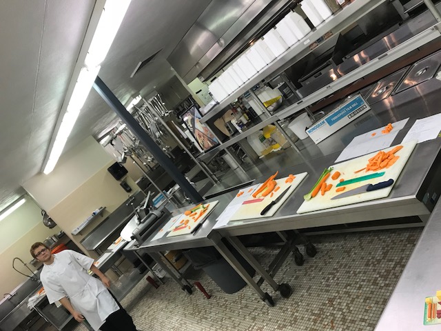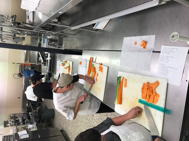 Professional Culinary Arts & Hospitality – The new Culinary students practiced new terminology and techniques to include dicing (small medium, and large), julienne, chiffonade, and tourne. Have you ever said to yourself, “What is a tourne?” This term refers to a method of cutting and peeling root vegetables into oblong, seven-sided football-like shapes. This classic French technique helps vegetables like carrots, turnips, and potatoes to cook evenly.