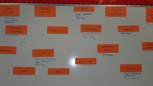 Students identified which careers interest them and added their names to our Program Shadow board, under their career choice. We plan to provide the opportunity for each student to spend a little time in the classroom of their choice to get a feel for the amazing training available!