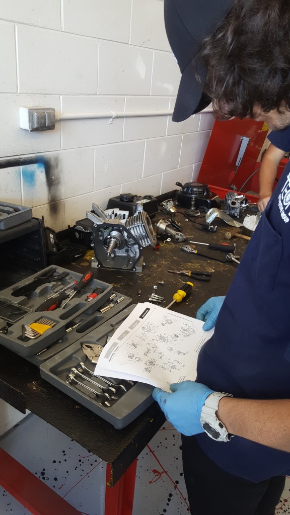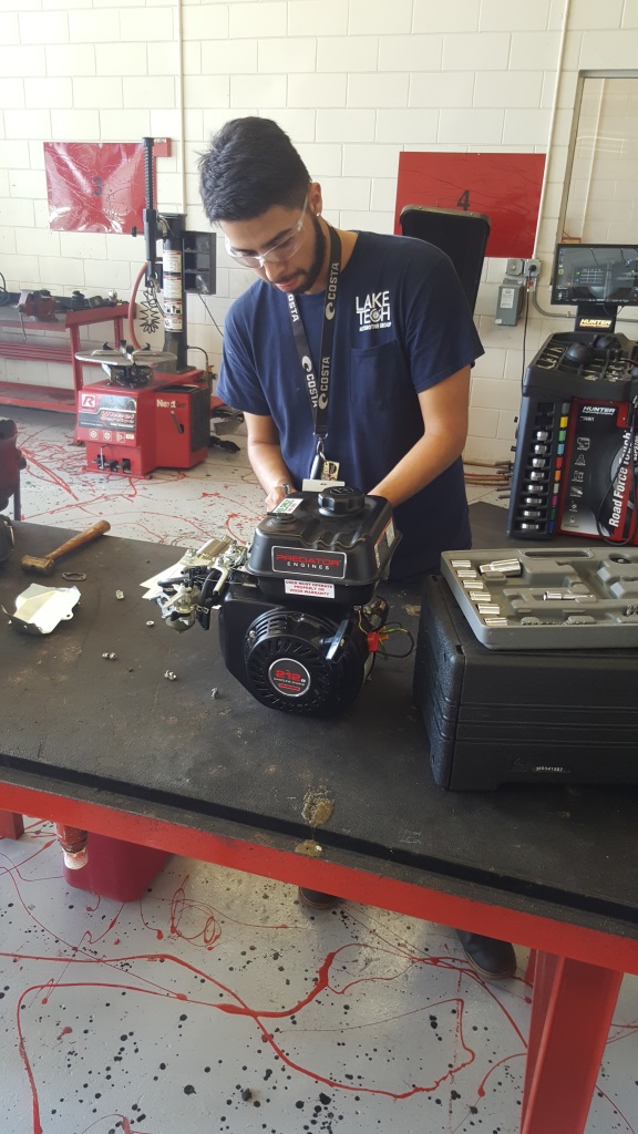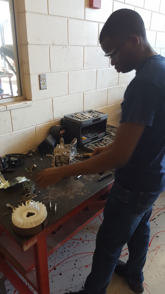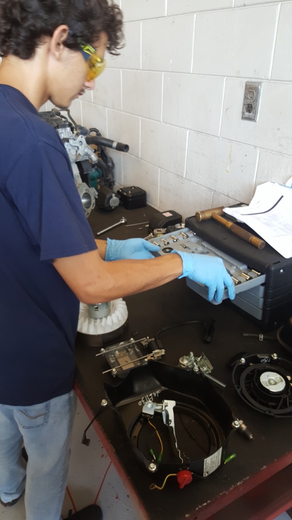 Automotive Service Technology – The pictures show our new students taking apart a small engine in order to get familiar with tools and their use as well as the name of the components that make up an engine and their function. They are also learning how important it is to be organized and to get everything back together the same way it came apart. All of this will be applied later on when they get ready to do their first 4, 6 or 8 cylinder engine tear down and rebuild.