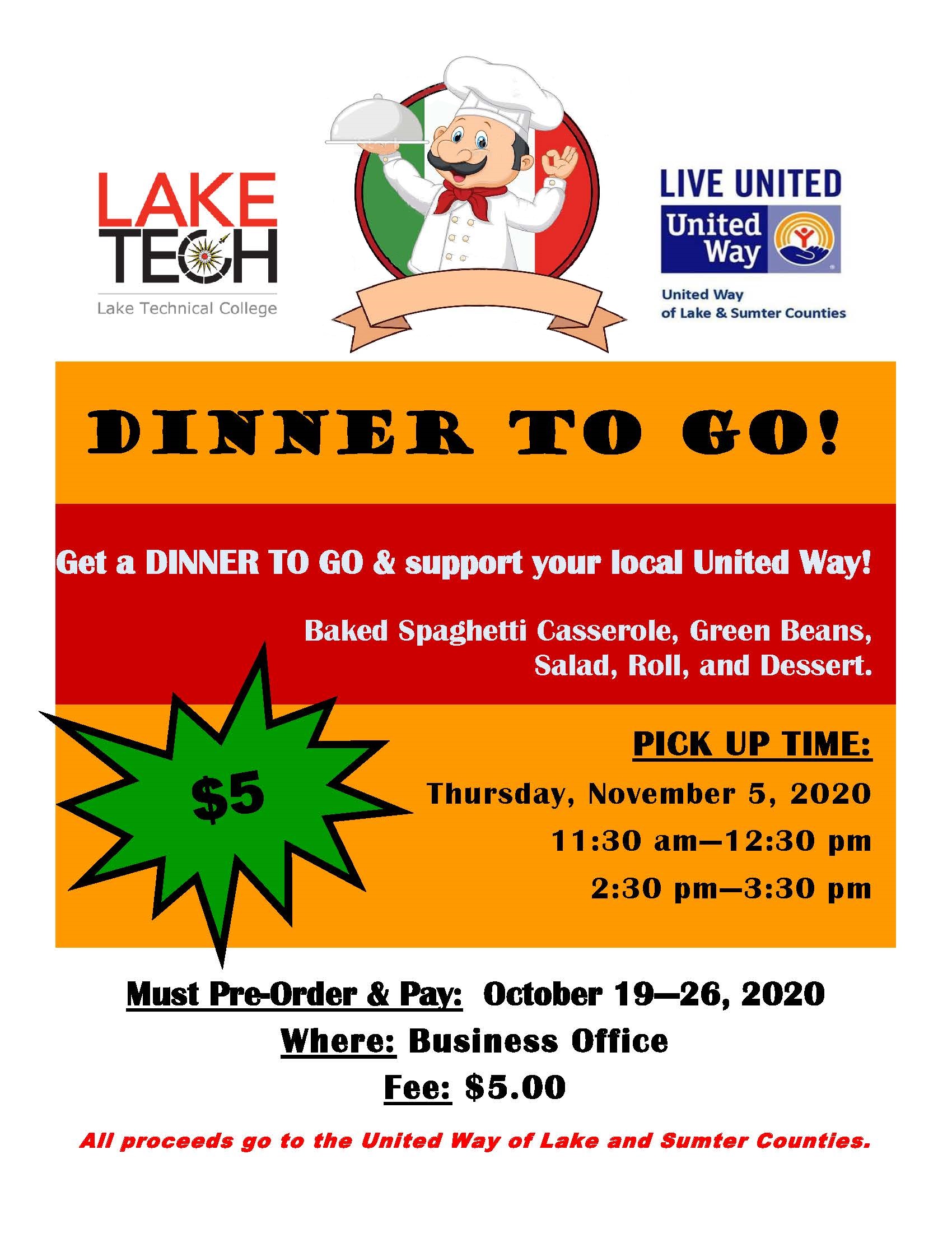 The United Way of Lake & Sumter Counties is a big supporter of Lake Technical College and our community. Each year, we participate in a fundraiser to give back to them for all they do. This year, the Culinary Team is planning a “Dinner to Go” for only $5. Pre-order in the Business Office during the week of October 19-26.
